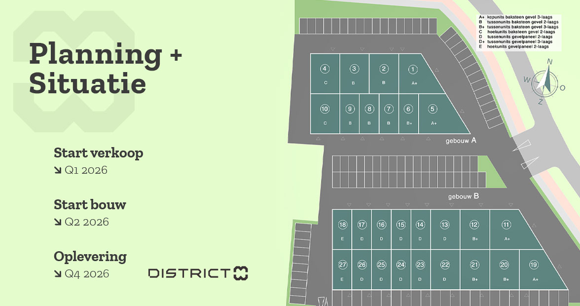 - Type B – Tussenunit (circa 150 tot 225 m²), baksteen gevel, 2 lagen
